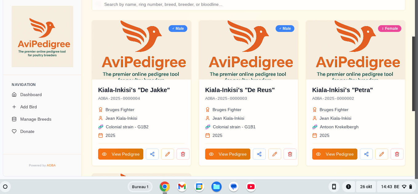 The premier online pedigree tool for poultry breeders, powered by AOBA. Effortlessly manage and visualize up to 5 generations of your birds' lineage, including breeder details, breed information, ring numbers, bloodlines, and photos. Build and share comprehensive pedigrees with ease.